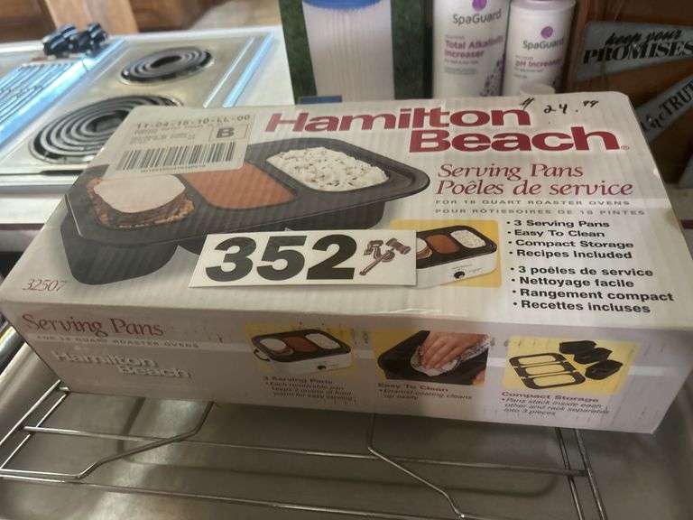 Lot contains 18 quart GE roaster oven with lid and Hamilton Beach serving pans to fit 18 quart roaster.