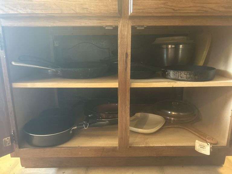 Lot contains miscellaneous, skillets, mixing bowls and Tupperware. Also includes a wooden pizza peel pizza serving tray.