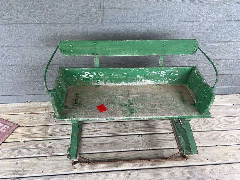 Lot contains vintage buggy bench. Measurements are 31 inches tall at the back, 38 inches wide, 29 inches deep.