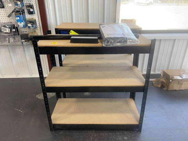 Lot contains metal shelving. Shelving is currently two pieces measuring 16 inches deep by 36 inches wide by 36 inches tall each. Lot also includes a ram cold-weather grill cover part number P68440614 AC.