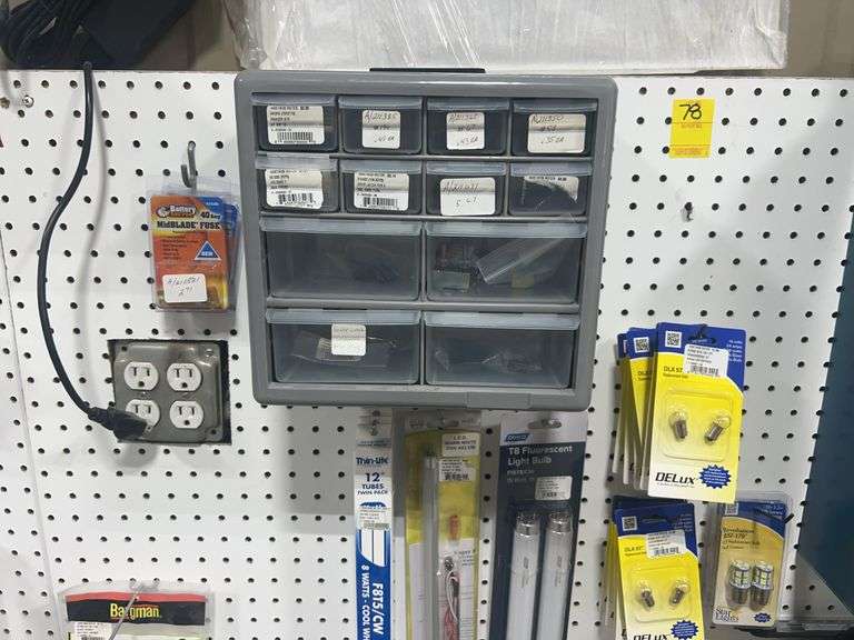 Light contains assortment of various sizes and wattage of lightbulbs brands include deluxe and starlight and Camco. pegboard hooks are not included in this slot.