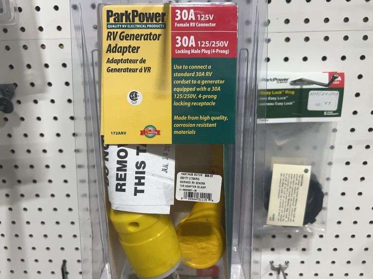 Lot includes Park power brand RV generator adapter part number 30 a, 125 V. Lot also includes park power RV replacement connector. Lot also includes easy lock ring, RV female connector body replacement. Lot does not include pegboard hooks.