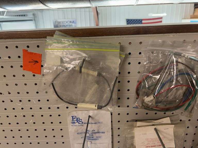 Lot includes an assortment of electrical accessories, and parts. Lot does not include pegboard hooks.
