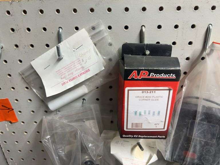 Lot includes wall of miscellaneous parts, lead leg, repair kit, sure, flow water, accessories, flying insect screens and much more. lot does not include pegboard hooks.