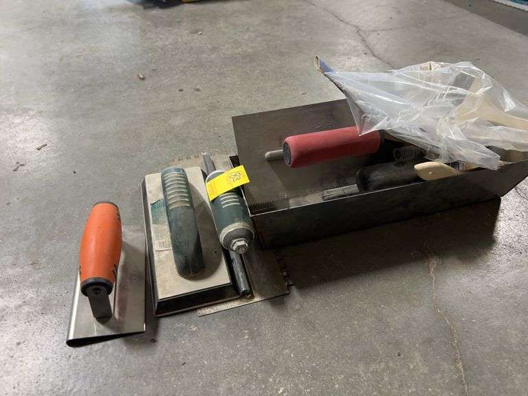 Lot includes concrete trowels brushes and more.