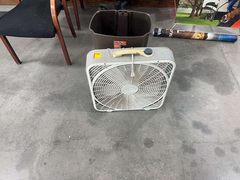 Lot contains Lasko box fan, 12.5 gallon trash can