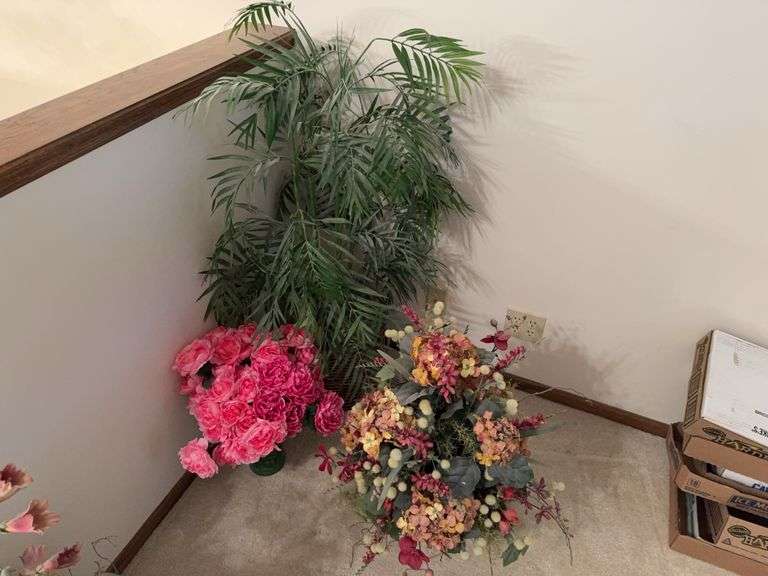 Lot includes an assortment of artificial floral arrangements, large, artificial flower wreath.