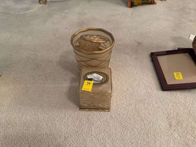 Lot includes decorative bathroom decor Including toothbrush, holder, soap, dish, Kleenex box holder, trashcan.