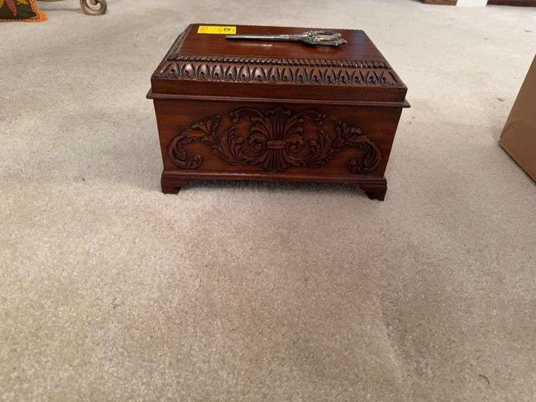 lot includes vintage wooden jewelry box measuring 8 inches tall by 12 inches wide by 8 inches deep. Lot also includes a pair of vintage grape scissors.