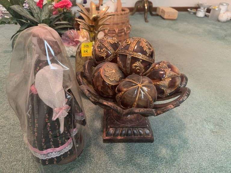 Lot contains decorative bowl with a set of decorative spheres, small glass base, decorative pineapple container.