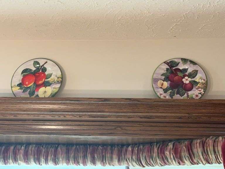 Lot include set of four decorative fruit plates, fruit, placemats, artificial floral arrangement, doilies, drink, coasters, pair of hummingbirds.