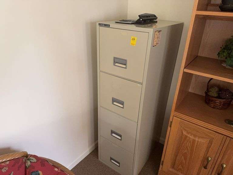 Law includes Schwab 2500 filing cabinet measuring 4 foot 5 1/2 inches tall by 1 foot 4 1/2 inches wide by 2‘1“ deep, lot also includes three whole punch, calculator.