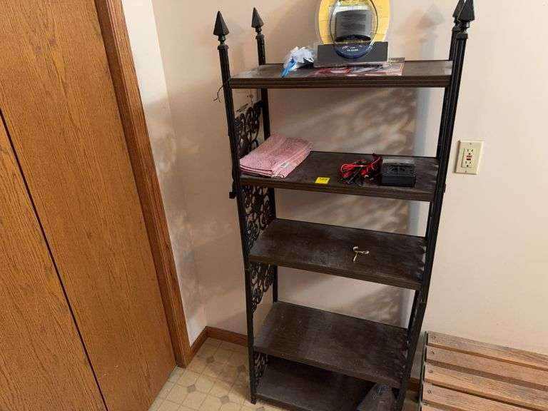 Lot includes shelf measuring 4 foot 8 1/2 inches tall by 2‘1“ long by 1 foot wide. Lot also includes contents, including multimeter and more.