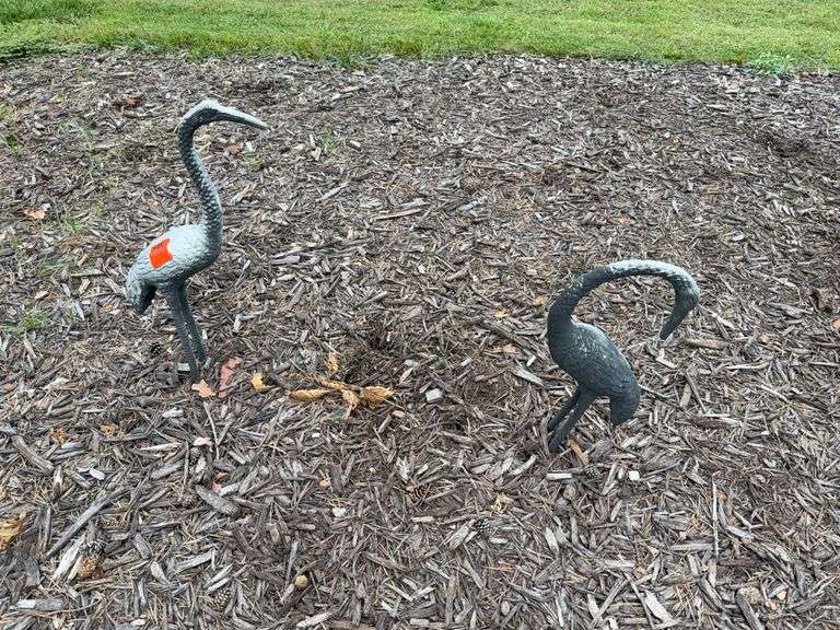 Lot contains two metal bird lawn ornaments. Ornaments stand 28 inches tall and 21 inches tall respectively.