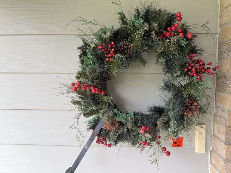 Lot contains a door hanging wreath, measuring approximately 15 inches in diameter and a cardinal welcome mat measuring 35 1/2“ x 23 3/4“