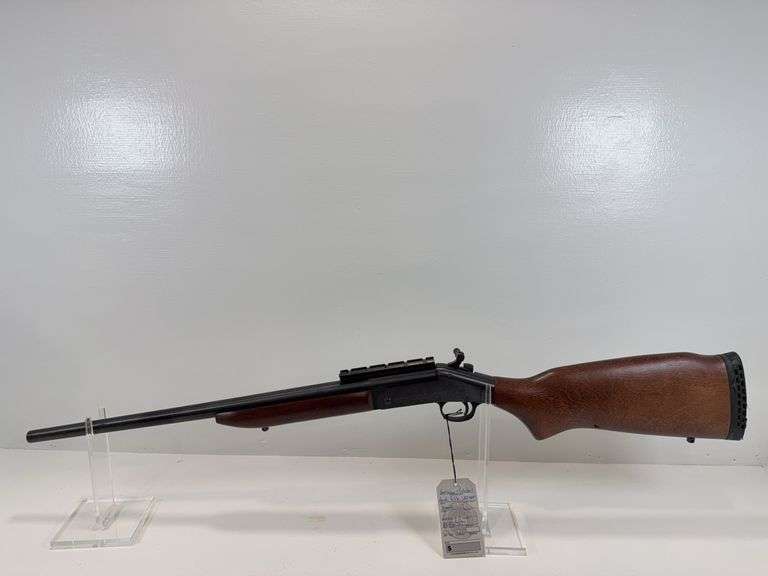 Harrington and Richardson handi-rifle chambered in 223 Remington. Brake action. Serial number HX272417. 22 inch barrel. Woodstock with blued barrel.