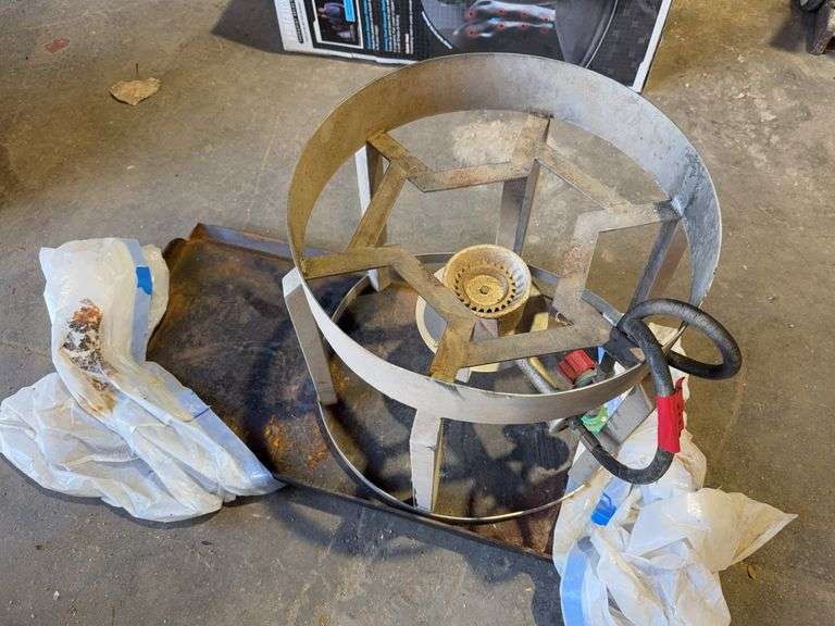 Lot contains a propane fueled pot burner measuring 15 3/4” in diameter and a cast iron griddle top measuring 32 1/2” wide by 15 1/2” deep.