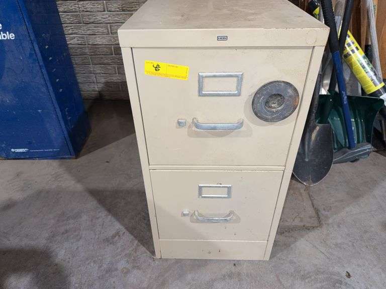 Lot includes two drawer filing cabinet measuring 2 foot 5 1/2 inches tall by 2‘1“ long by 1‘3“ wide.
