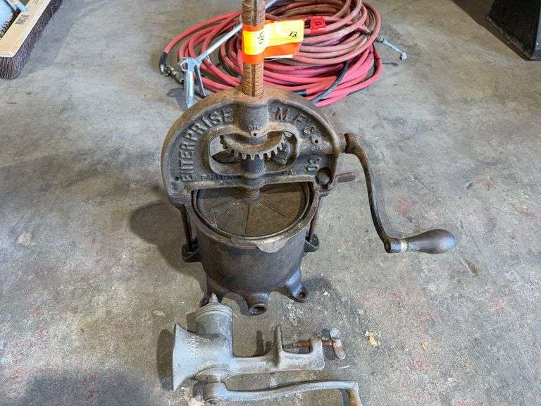 Lot includes vintage Enterprise sausage stuffer, vintage meat grinder.