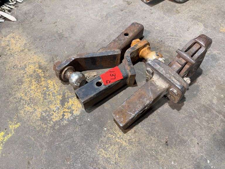 Lot of 3 2” hitches. 2 drop hitches with 2” and 2 5/16” balls, 1 pintle hook hitch.
