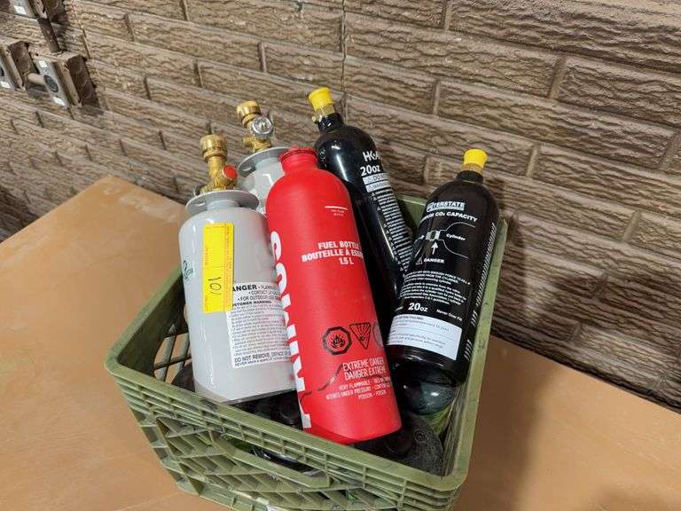 Lot contains an assortment of fuel and propane bottles. Lot also contains to CO2 bottles.