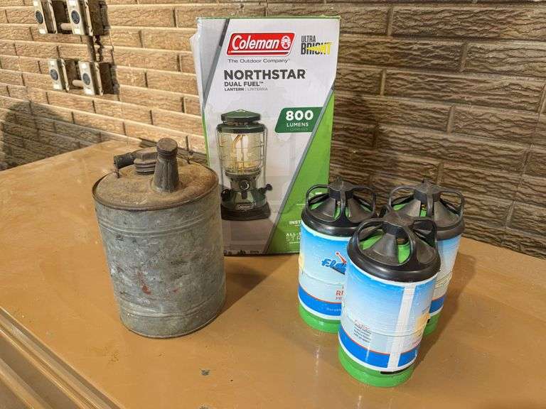 Lot contains a Coleman Northstar lantern new in original box, three refillable camp stove propane cylinders, and a vintage oil can.