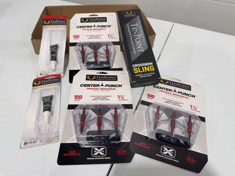 Lot contains Ten Point Crossbow Technologies brand accessories including (3) 3 pack premium broad head points, 100 grains, 1-7/8” cutting dia. Crossbow sling, (2) flight rail & trigger lube. All items new in original packaging.