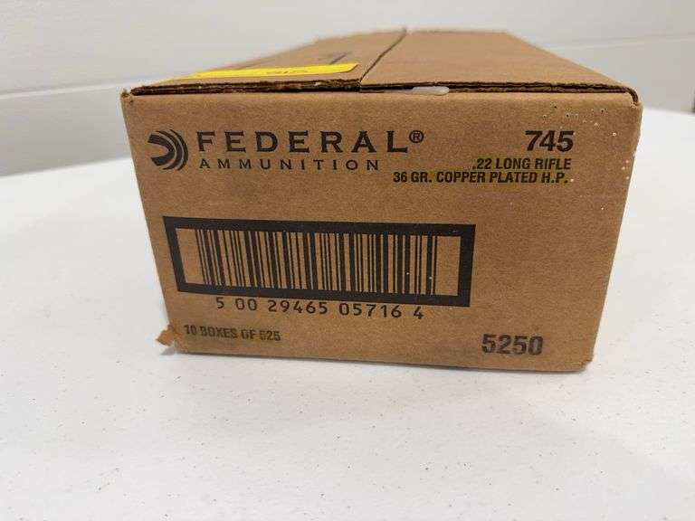 Lot contains Federal ammunition .22 Long Rifle, 36 GR. copper plated H.P. 5,250 rounds in original packaging.