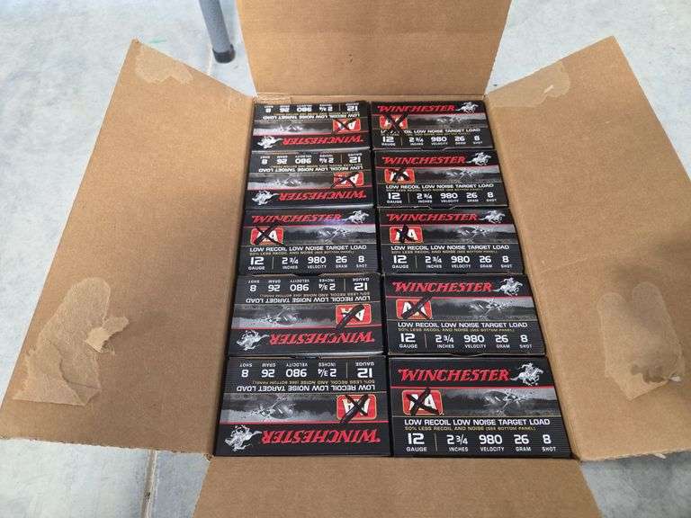 Lot contains 10 boxes of 12 gauge Winchester AA Target Load ammunition. Specifics include shell size 2¾", 980 velocity, weight of 26 grams, and 8 shot.