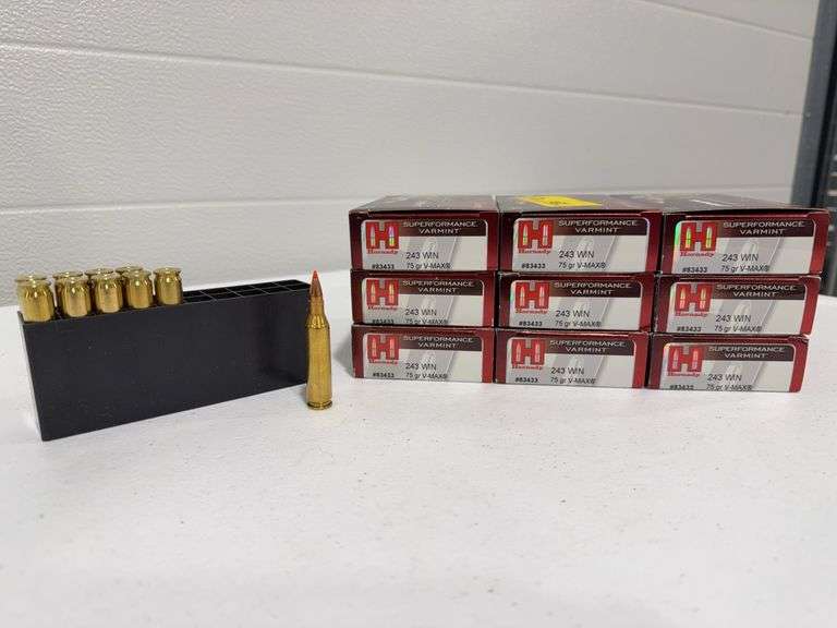 Lot contains Hornady 243 WIN ammunition, 75 grain V-MAX. 190 rounds new in packaging.