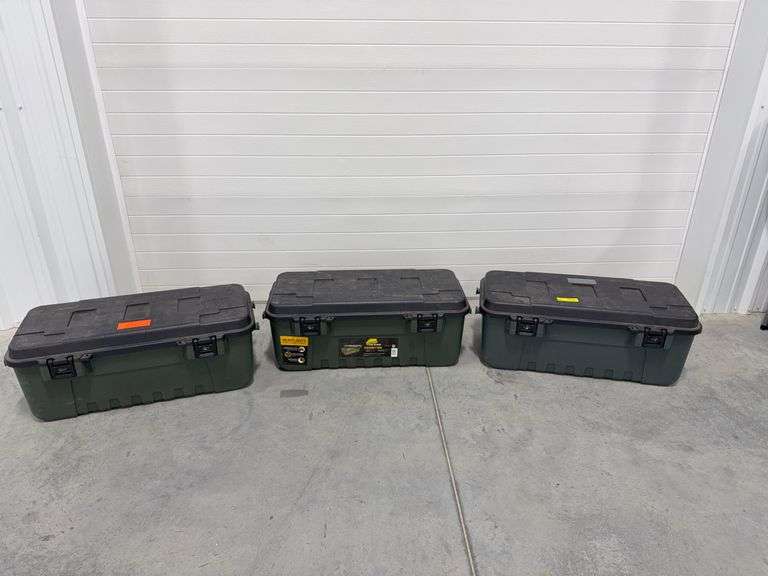 Lot contains three heavy-duty trunks with integrated wheels, and each trunk has 108qt capacity.