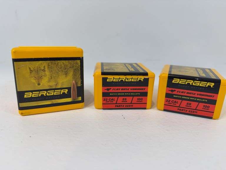 Lot contains three boxes of Berger 22 cal 55 grain bullets. Total 280 bullets.